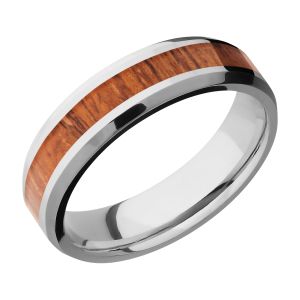 7 mm wide/Beveled/Titanium band with one 4 mm Centered inlay of Hardwood.