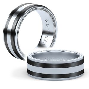 A two-tone band with maximum effect: this design features two stripes of durable, lightweight titanium inlaid on lustrous gold. Choose black or gray titanium combined with either rose, yellow, or white gold to make this ring your own. Verragio' s Signature Beading along the edge adds sophisticated style, while the bold 8mm width fits comfortably for everyday wear. Available in 14KT and Platinum.