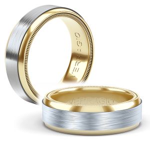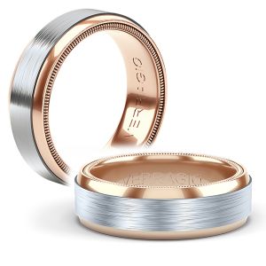 With this new two-tone design, durable grey titanium meets an inner layer of lustrous gold with a sleek beveled edge. Choose black or gray titanium combined with either rose, yellow, or white gold to make this ring your own. Verragio’ s Signature Beading along the edge adds sophisticated style, while the 7mm width fits comfortably for everyday wear. Available in 14KT and Platinum.